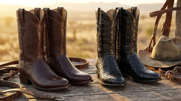 トカゲ革とカイマン革は、エキゾチックブーツ素材の distinct category に属するコアな特徴を共有しています。その価値は、質感と仕上げのユニークな組み合わせから生まれます。